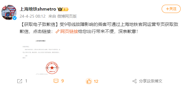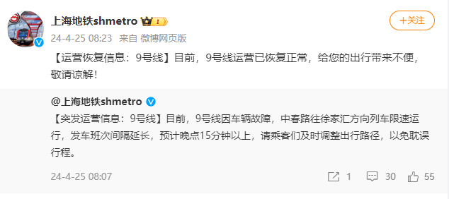 今晨的故障,是9号线在4天内的第2起。网友:有点频繁了......