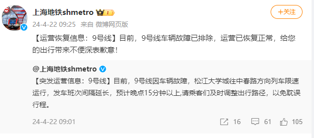 小新注意到,本周一(4月22日)上午,9号线也曾发生故障。