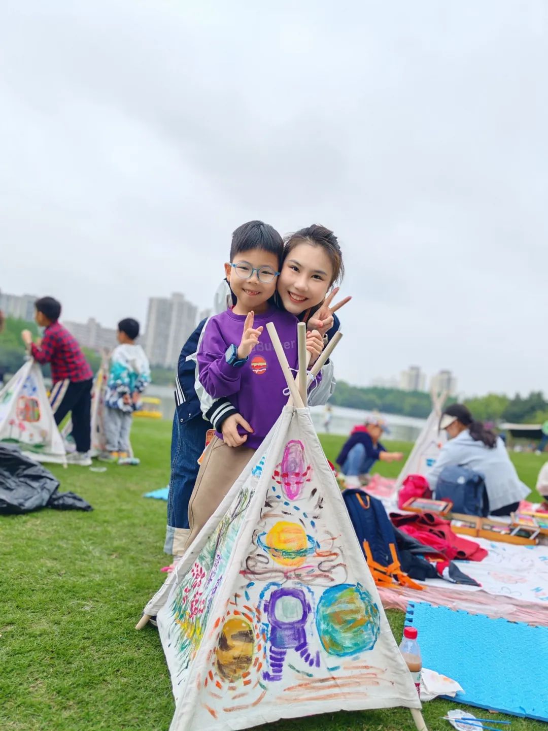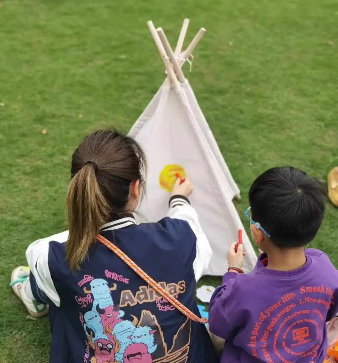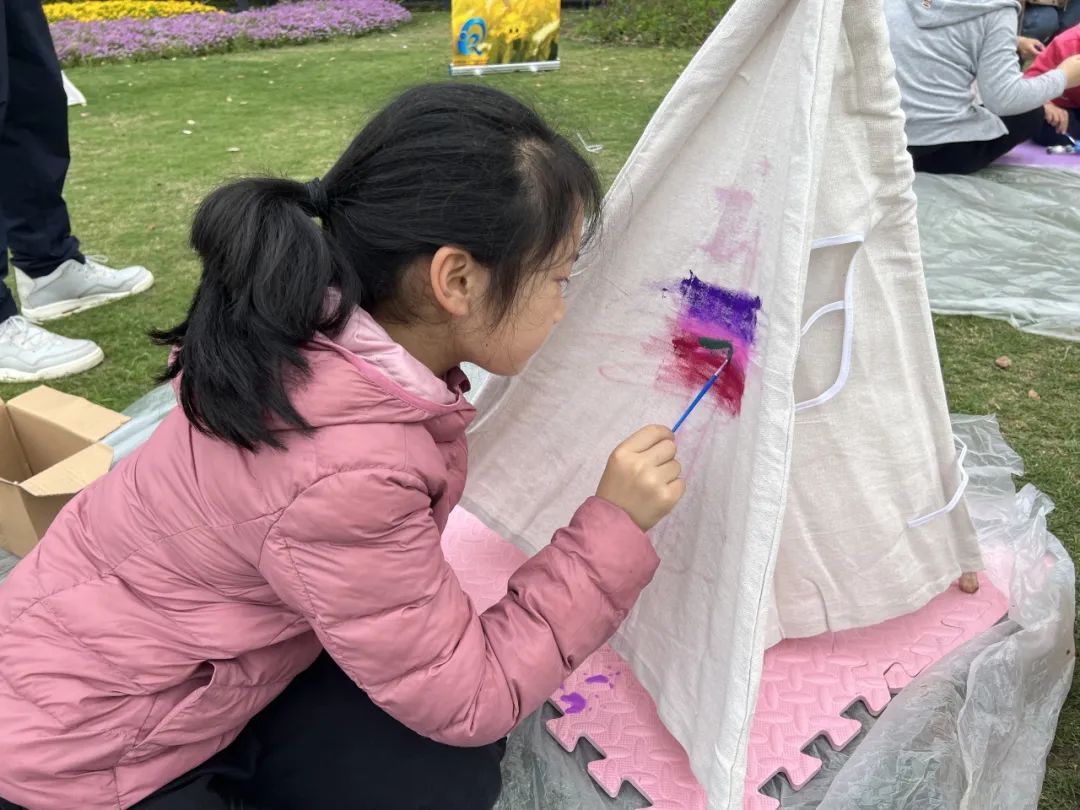 现场,阳光明媚,微风拂面。在社工老师的引导下,亲子家庭有序地分成几个小组,开始了田野踏青之旅。首先,活动进入帐篷涂鸦的环节。孩子们发挥自己的想象力和创造力,用五彩斑斓的画笔在帐篷上绘制出各种可爱的图案和文字。有的画出了蓝天白云,有的画出了花朵蝴蝶,还有的写上了自己的心愿和祝福。每一顶帐篷都变成了孩子们心中的小天地,充满了童真和乐趣。