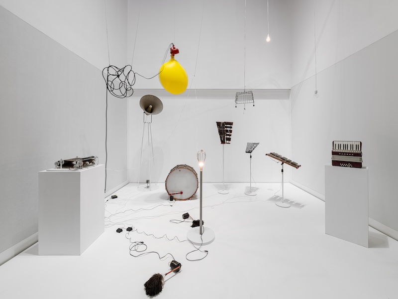 展览中,日本艺术家毛利悠子的作品《游行》将物品和乐器汇聚在一起,形成一个出乎意料的交响乐团。这件作品带着杜尚的现成品概念,以及激浪派艺术家在20世纪70年代的音乐现成品实验产生共鸣。侧耳倾听,电动装置令这些物件遵循精确的乐谱运行,音调、音色和音质似乎在一个个物体之间展开对话,提醒我们在不和谐的声音中捕捉到和谐是一项永不停歇的工作。