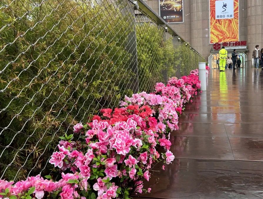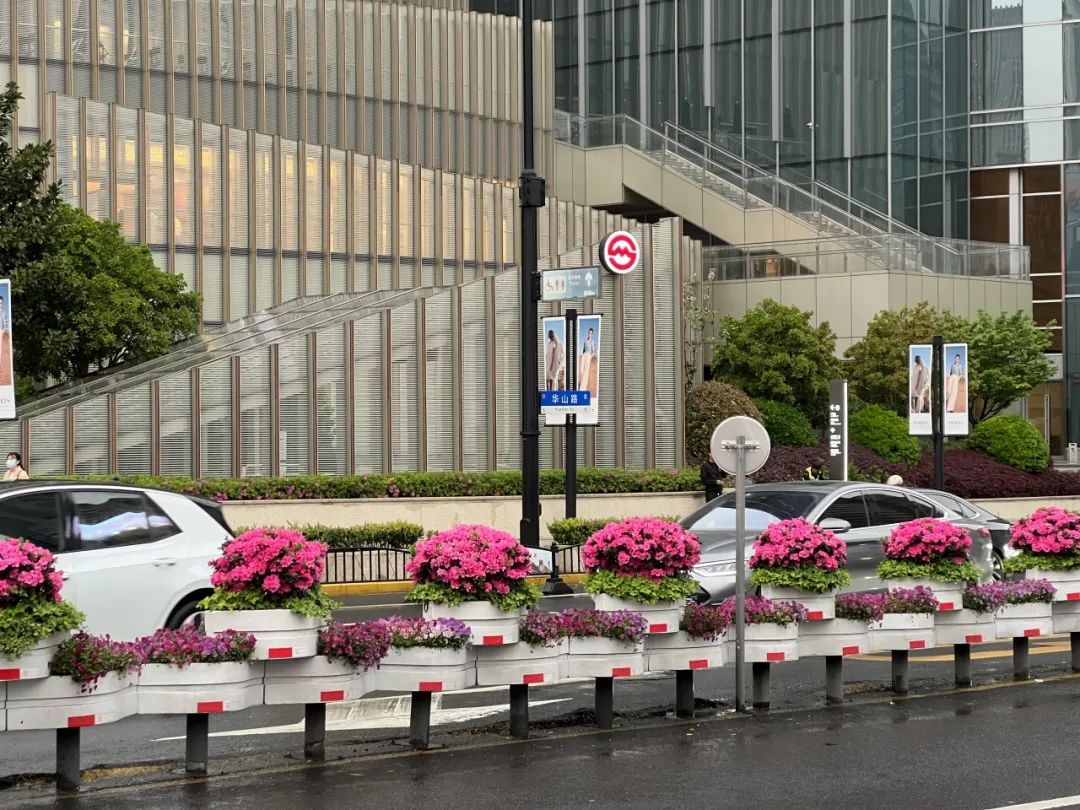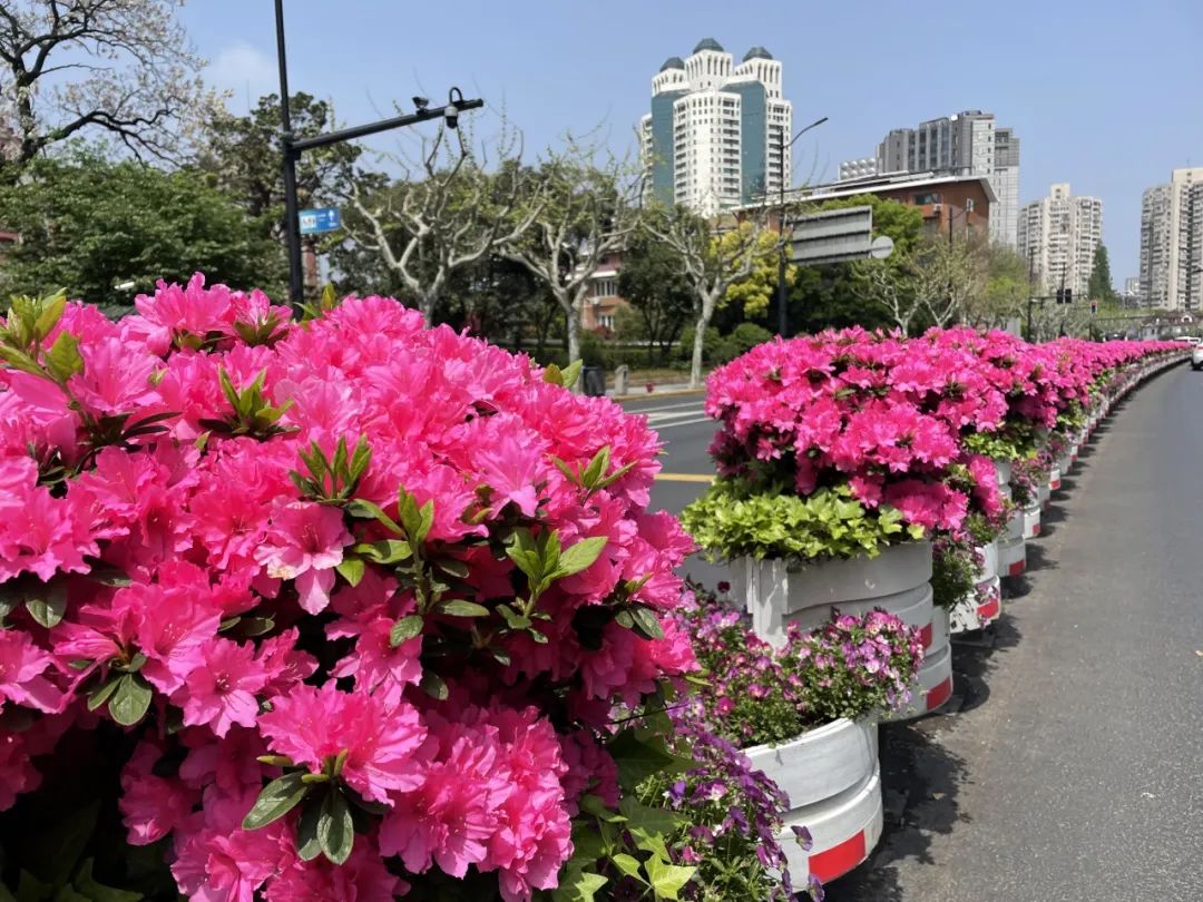 在华山路道路花箱,杜鹃形成连绵起伏、浪漫无比的花海,婀娜多姿、形态各异的杜鹃花如锦似缎地铺开,把春日绚烂到了极致。