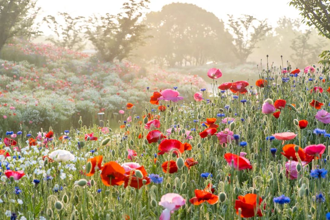 眼下,一眼望不到尽头的花田间,大片大片色彩绚丽的虞美人铺就成浪漫的春日花毯,一簇簇花朵在和煦的阳光下泛着有如绢丝般的光泽,微风吹过,轻轻摇曳,炙热又浪漫。虞美人的最佳观赏期将延续至5月中旬。