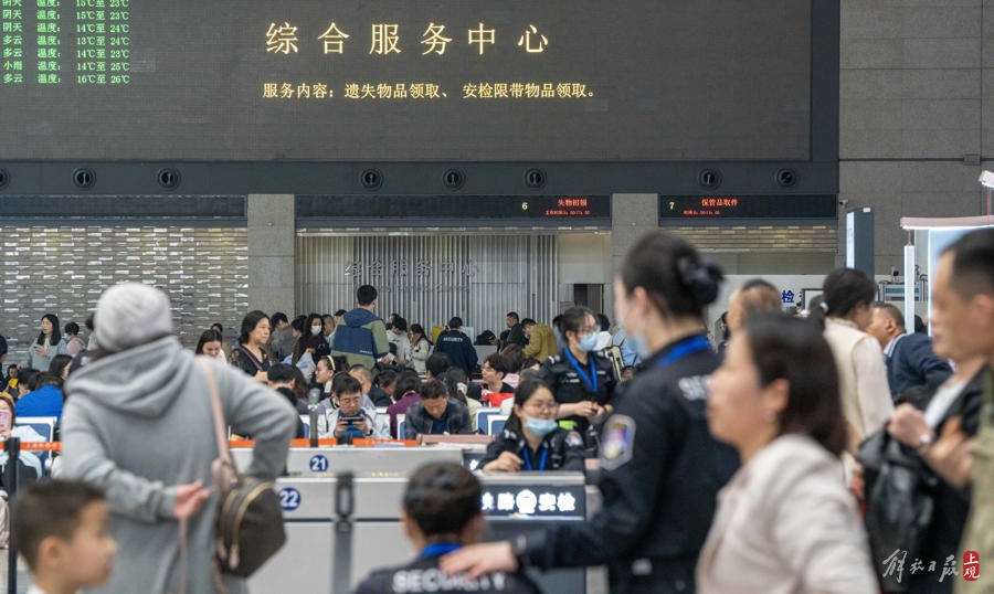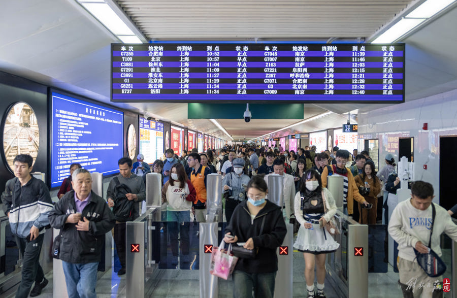上海站组织休班党团员和志愿者,在检票口、电梯口、地道口、“心尚”服务工作室、服务台等岗位,提供安全防护、方位指引、重点帮扶、问询解答等服务。