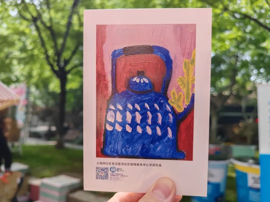 除了商户,市集还邀请了不少公益组织来摆摊,向市民宣传公益事业。上海慧灵是一家关注孤独症青少年的公益组织,在这次市集中,他们带来了许多由孤独症学员创作的手工作品以及名信片。手工作品以公益价格售卖,而印有孤独症学员绘画作品的名信片则免费赠送给市民。“这些作品都是我们的老师带着孤独症学员做的,销售所得一部分作为劳务费给予这些学员,其它的均用于关注孤独症患者的公益事业,让他们体验到通过劳动所带来的成就感。”上海慧灵公益组织的一位负责人说道。