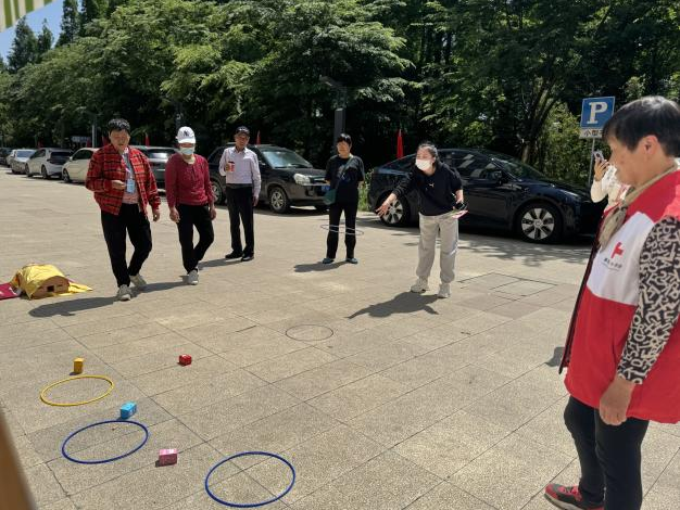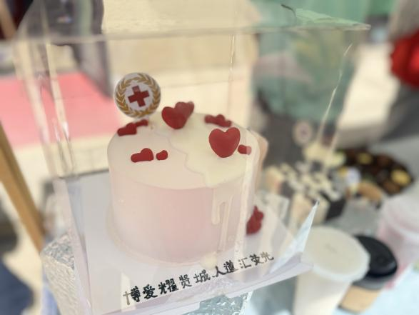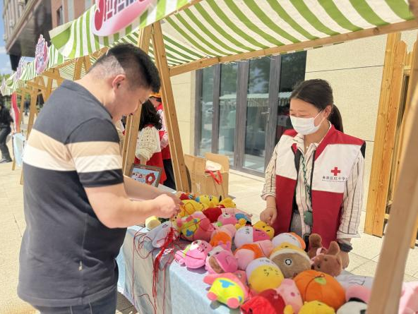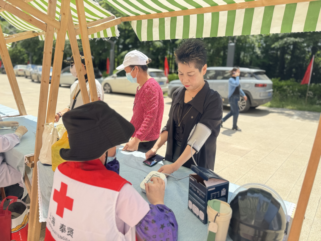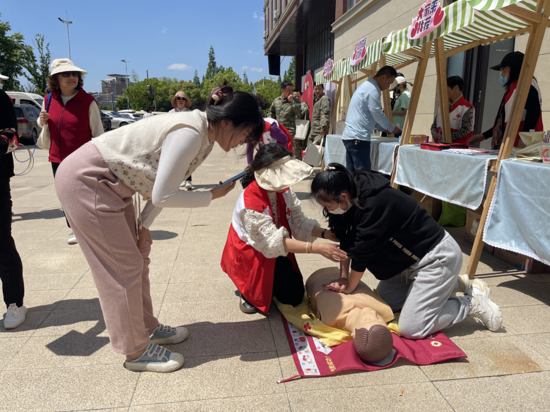 在外场的空地上,海湾镇红十字会组织志愿者们支起了一个个小摊位,有心肺复苏技能展示,有量血压、测血糖义诊服务,有红十字小游戏,还有美味的点心,吸引了不少社区群众驻足体验。