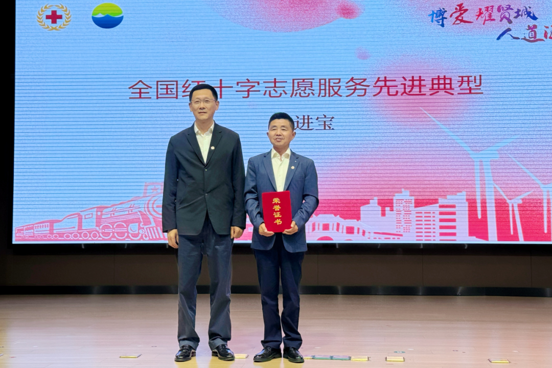 现场为全国红十字志愿服务典型“小皮匠”吴进宝颁奖