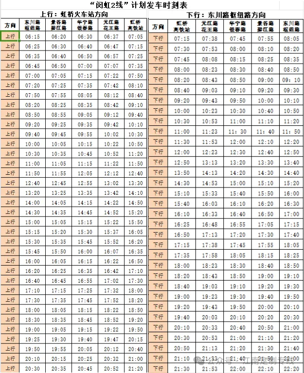 2024年5月15日起,将对“闵虹2线”营运时刻表作部分微调。调整后的发车时间,详见下图:
