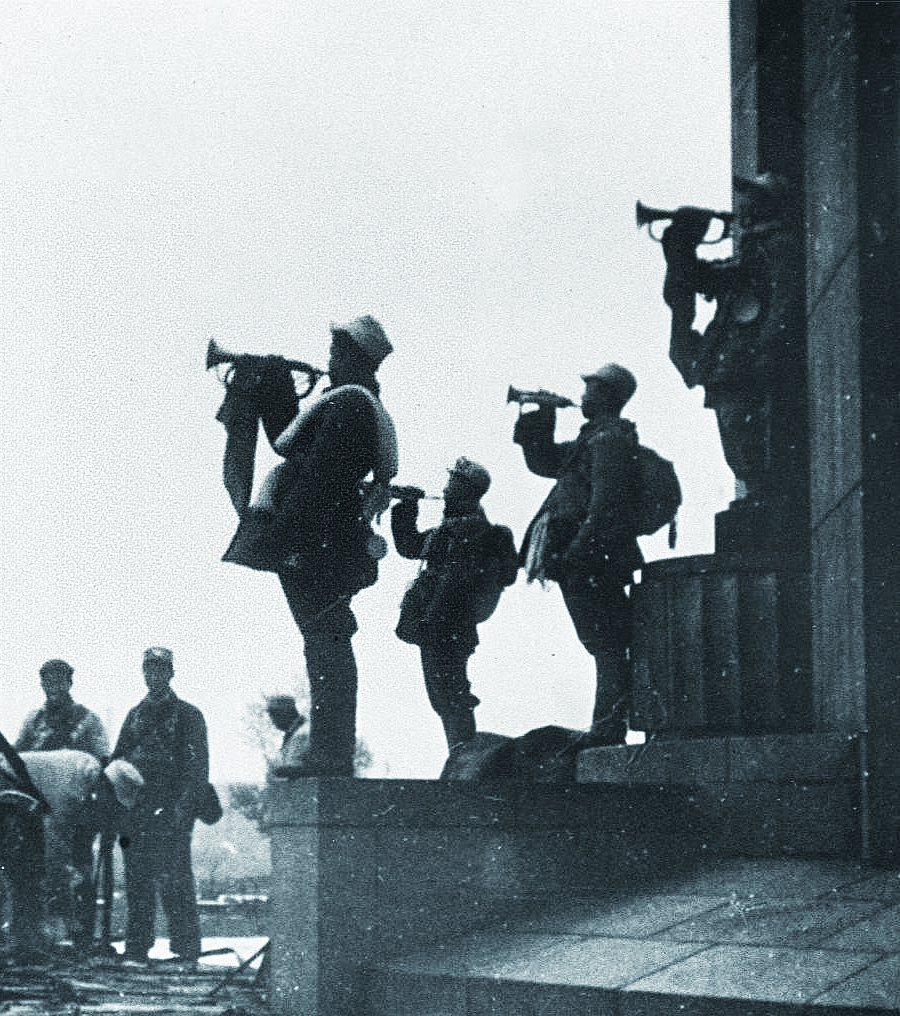 辽沈战役胜利后,司号员吹响号角。
