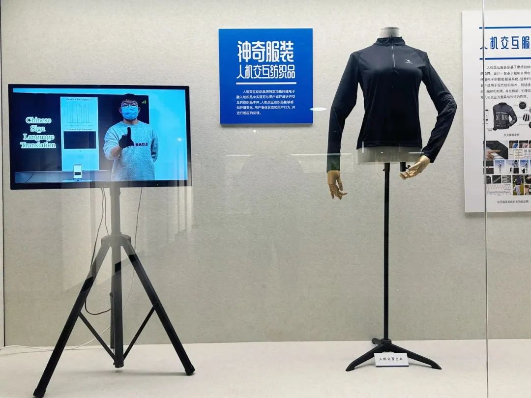 展厅里,一件件神奇的展品让人目不暇接。一件看似普通的衣服,左手手肘部位却显示着1—9个数字和一些简单的符号,如果按动上面数字键再点击“电话”符号,就可以拨打电话了,原来这是一件人机交互服装。