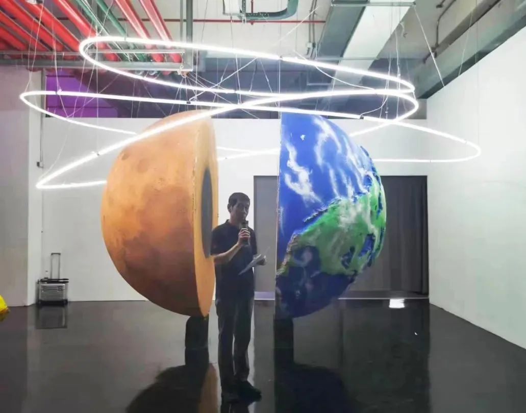 本次科学艺术展别出心裁地设计了地球和宇宙两条观展动线,涵盖“地火之间”“探索黑洞:虚空之旅”“月相:随心”“光的漫游”“戏月”“在月”“生命之源—宇宙之初”等16个主题展品。观众可分别从地球或宇宙出发,沉浸式体验前往太空探索浩瀚宇宙,或从宇宙归来,再度感知地球的美好。大家通过美和艺术的方式了解宇宙、欣赏宇宙的同时,也能从宇宙视角回望地球,重新认识人类家园,进一步思考人类与宇宙的关系,以及与地球环境的关系,同时又能够感受它们背后的科学奥秘。