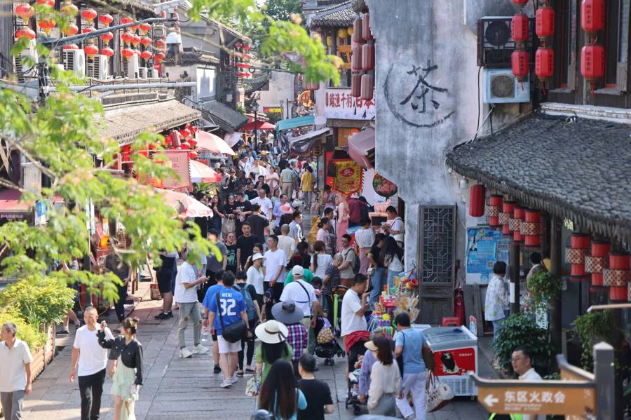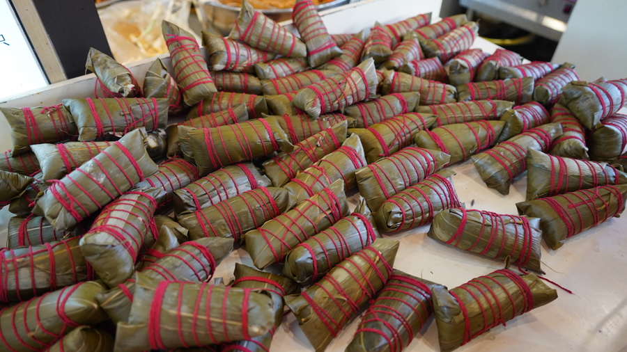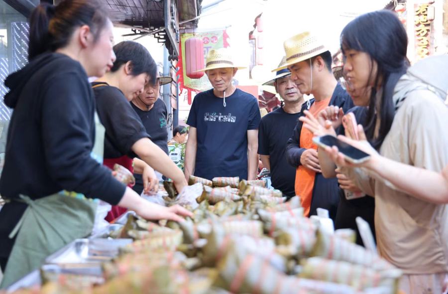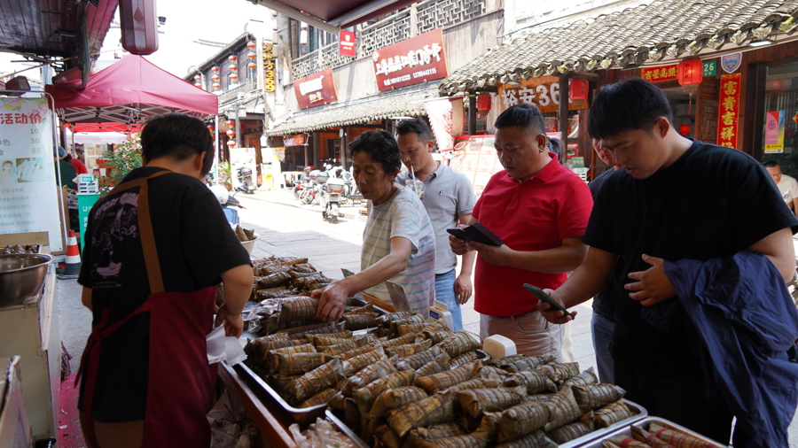 端午小长假,金山区枫泾古镇迎来客流小高峰,许多游客都冲着枫泾粽子而来。经典的口味,创新的卖点,让他们年复一年地前来品尝、采购枫泾粽子。