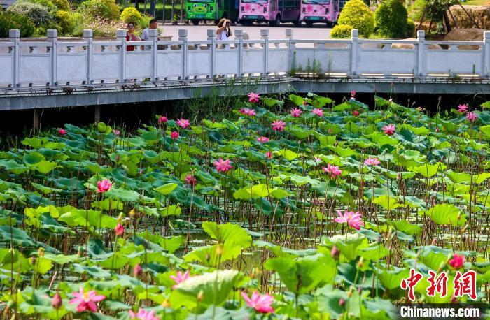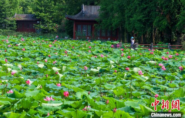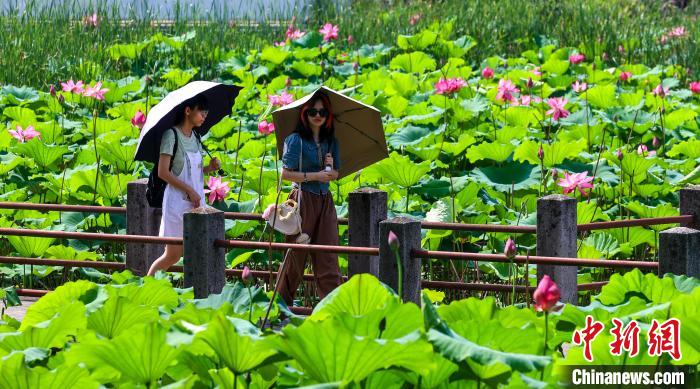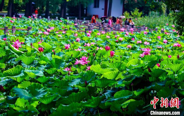 6月13日,武汉东湖磨山荷池碧荷连天,吸引市民和游客前来观赏。眼下正是武汉荷花绽放时节,公园、景点、郊区田野处处可见荷花摇曳。图为市民观赏荷花。张畅 摄