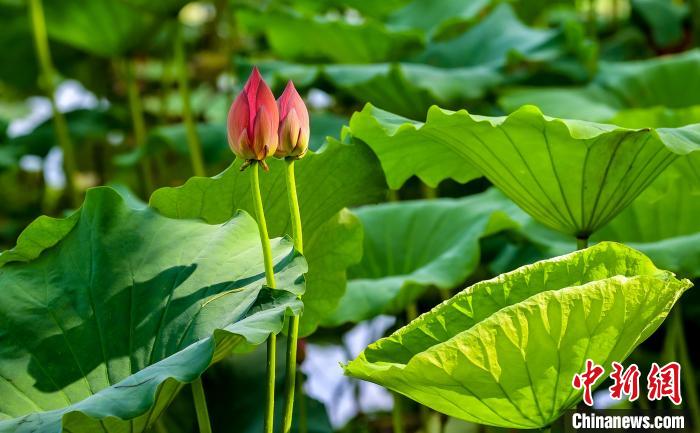 6月13日,武汉东湖磨山荷池碧荷连天,吸引市民和游客前来观赏。眼下正是武汉荷花绽放时节,公园、景点、郊区田野处处可见荷花摇曳。图为荷花娇艳出水,亭亭玉立。张畅 摄