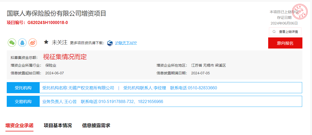 据国联人寿在上海联合产权交易所披露的增资项目显示,公开征集买家,拟募集资金总额视征集情况而定,信息披露起止日期为6月7日至7月5日。