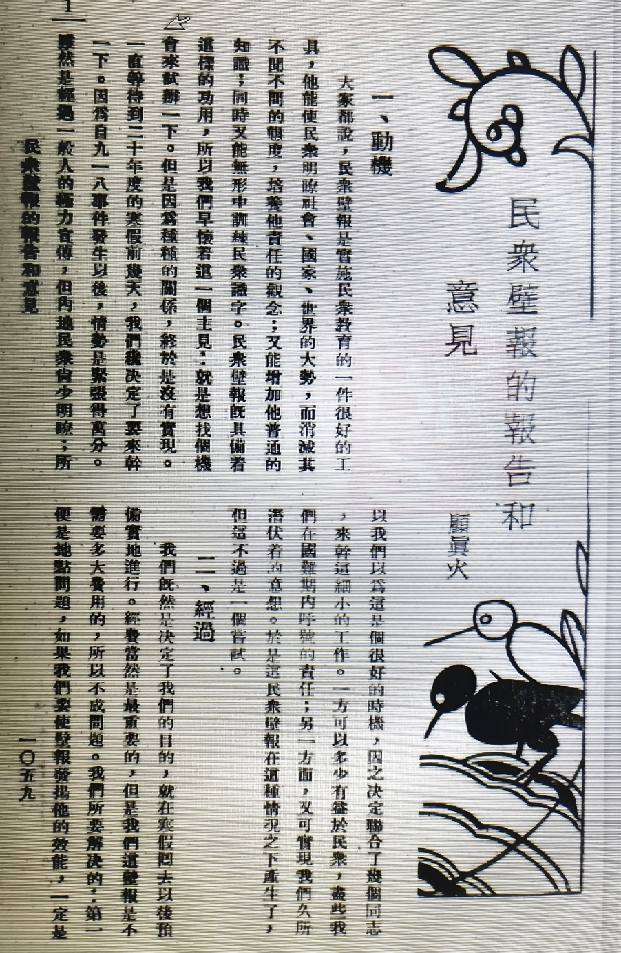 1933年2月,由江苏省立教育学院创办的《教育与民众》(半月刊)出版第四卷第四期,刊登顾真火撰写的《民众壁报的报告和意见》,讲述自编民众壁报宣传抗战的心得体会。顾真火,是革命烈士顾振(1913—1942,原名顾增福)的笔名,当时他年仅19岁,正在江苏省立太仓师范学校读书。