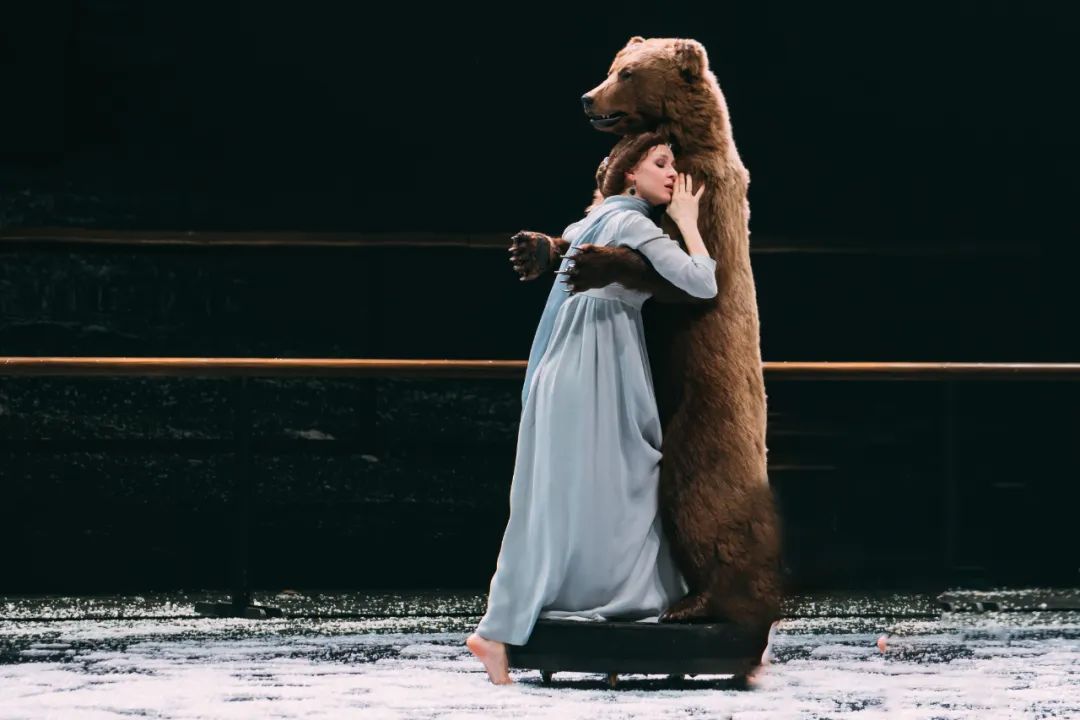 舞台上,每一个细节都透露出浓厚的俄式风情。剧目开场,白衣少女们轻盈起舞,纯洁而充满生机的气息弥漫全场。塔季扬娜赤足奔跑,高声宣告着爱情的到来;连斯基与奥涅金的决斗,在古老的法兰西旋律中落下凄美的雪花;婚礼上,少女们如天使般缓缓升空,塔季扬娜经历了人生的蜕变。而结尾处,塔季扬娜与熊共舞,幻想与现实交织,为观众呈现了一场视觉与情感的盛宴。