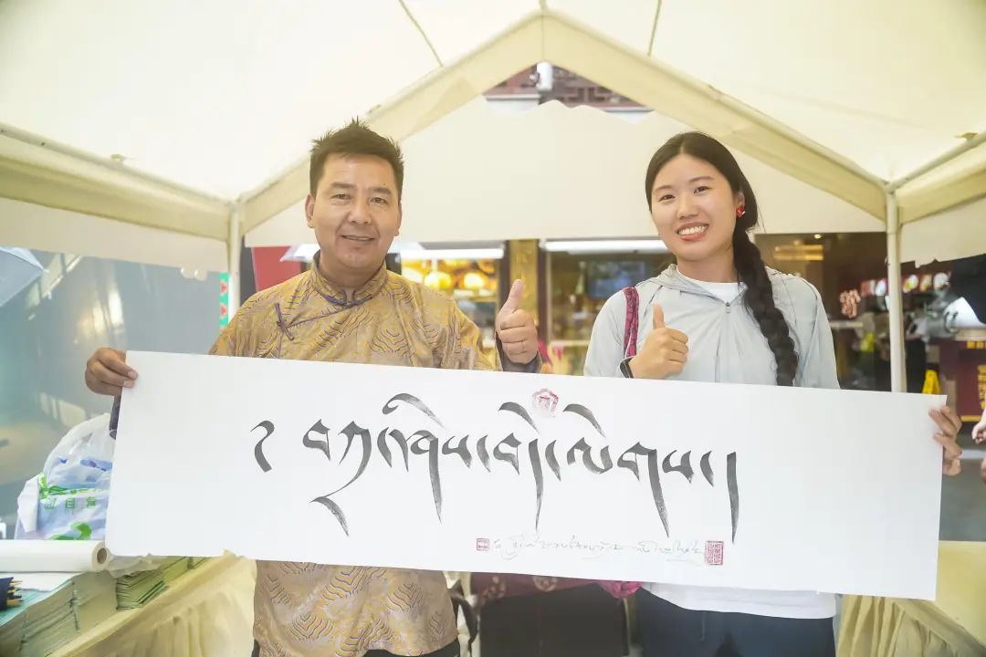 此外,活动现场还设置了多个特色展区,包括藏文书法作品展区、非遗文化体验区、文创产品展示区等。市民游客可以现场领取由林芝市书法美术家协会会员赠送的藏文书法作品,或在“贡康桑,上海!”拍照打卡墙前合影留念。同时,现场还设有互动问答环节,参与者有机会获得巴宜区特色文创小礼品。