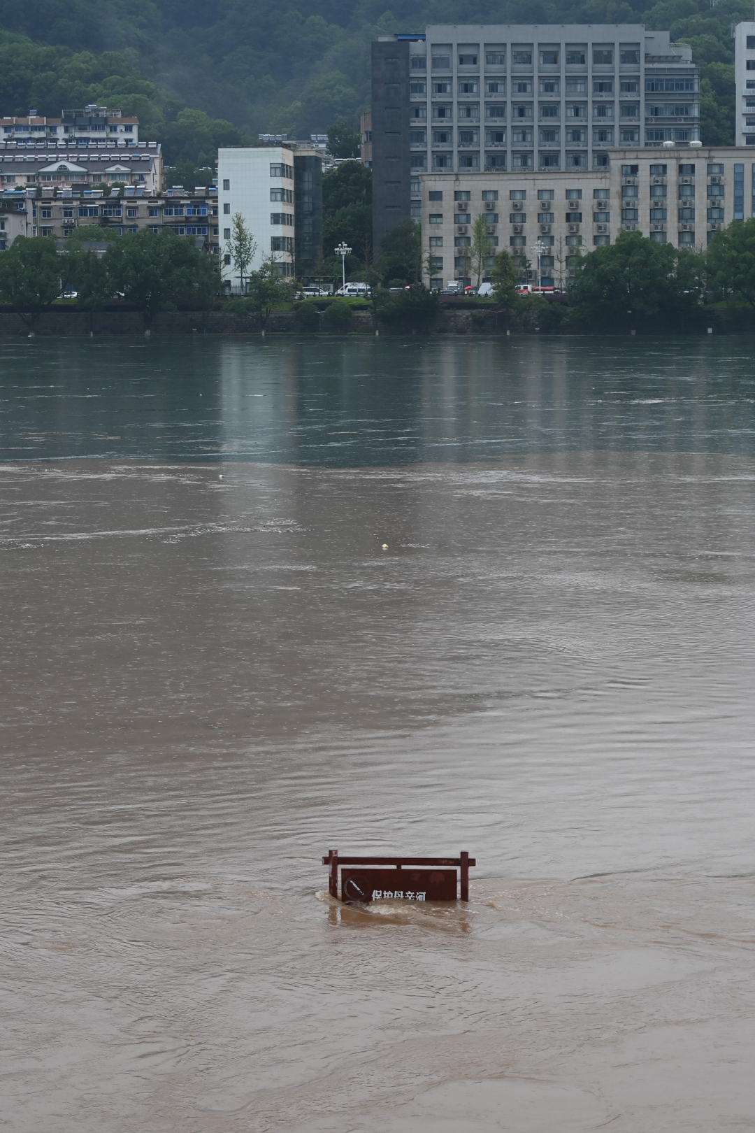 2024年6月24日,位于浙江建德城区新安江畔绿道的一块标牌已被洪水部分淹没。新华社记者 黄宗治 图