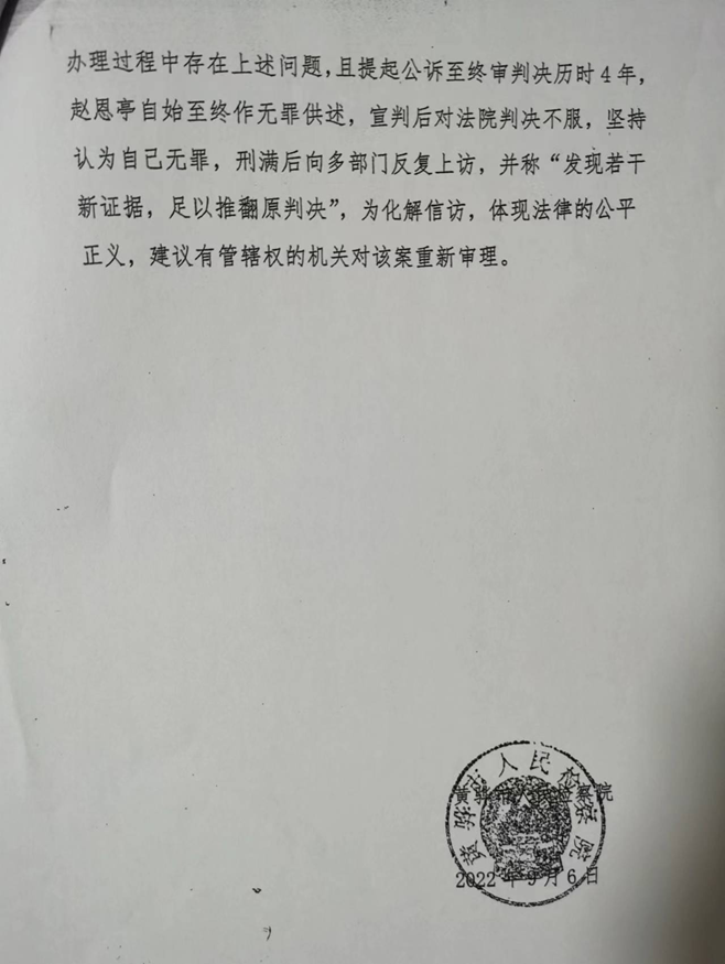 赵恩亭坚持认为自己无罪,又向相关部门进行信访。2022年9月6日,该案公诉机关——黄骅市检察院向黄骅市委政法委所作的《关于赵恩亭信访事项核查情况的汇报》(下称《汇报》)载称,黄骅市检察院认为,该案在办理过程中存在问题,且提起公诉至终审判决历时4年,赵恩亭自始至终作无罪供述,宣判后对法院判决不服,坚持认为自己无罪,刑满后向多部门反复上访,并称“发现若干新证据,足以推翻原判决”,为化解信访,体现法律的公平正义,建议有管辖权的机关对该案重新审理。