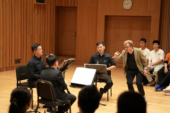 两位重量级演奏家的到来,让现场气氛热烈。温泽·福兹率先登场,上海爱乐的黑管三重奏演奏了莫扎特《单簧管三重奏作品439b》,他耐心地为乐手指点,大家都是专业演奏员,讲解更多注重情感的传递和细节的处理。上海爱乐单簧管演奏员李栩和福兹是旧识,早在克利夫兰求学时就曾特意飞到纽约上过他的大师课,对他认真严谨的态度记忆犹新。