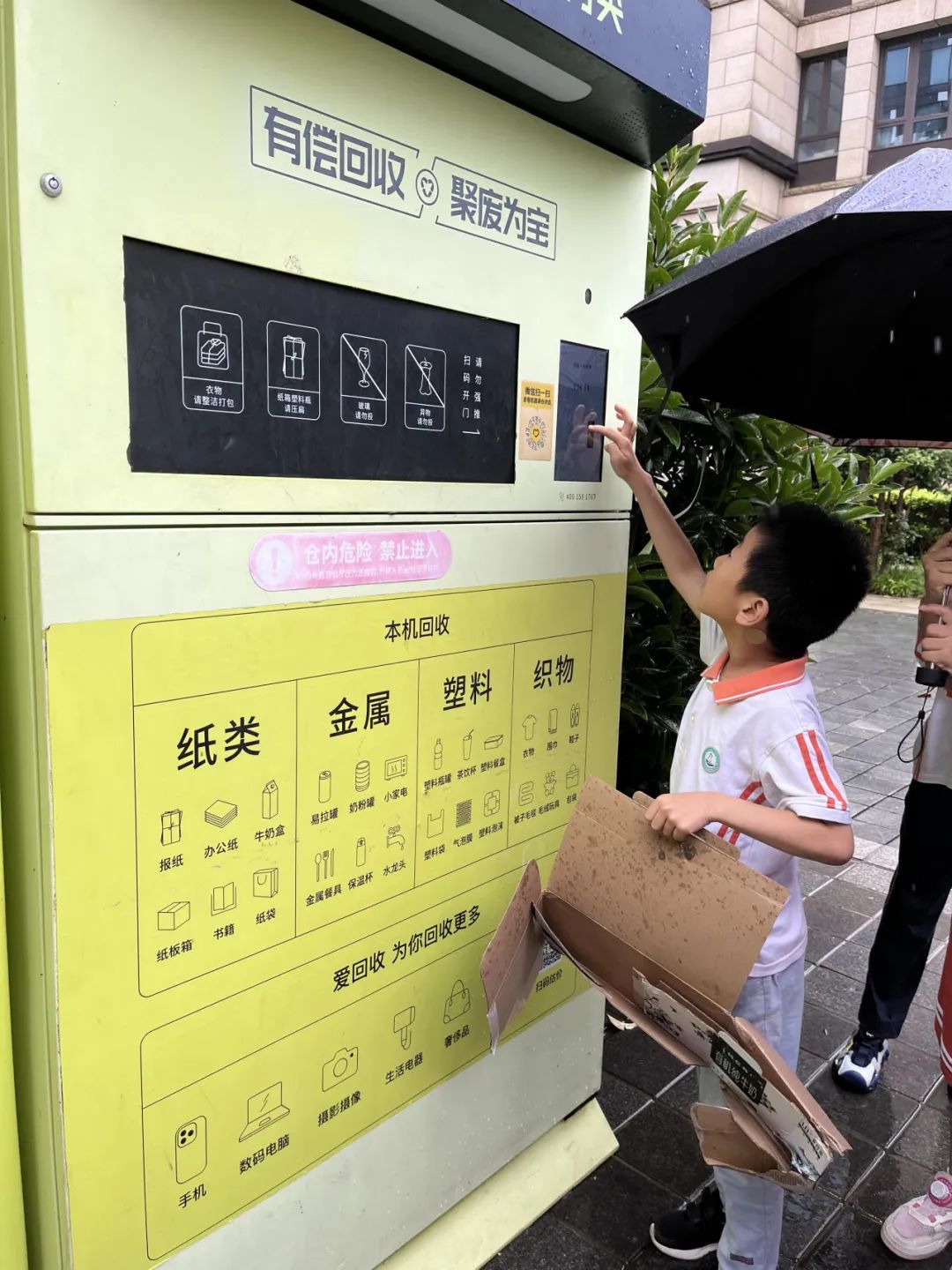 在参观过程中,师生们首先来到了“爱回收·爱分类”的智能回收机点位,在工作人员的指导下,学生们亲手操作了智能回收机,将废弃物投入相应的回收口。机器迅速识别、自动称重,并给予相应的积分奖励。这一新奇的体验让学生们兴奋不已,他们纷纷表示,智能回收机不仅操作简单,而且能够即时反馈,让他们切实感受到了垃圾分类和回收的乐趣与意义。