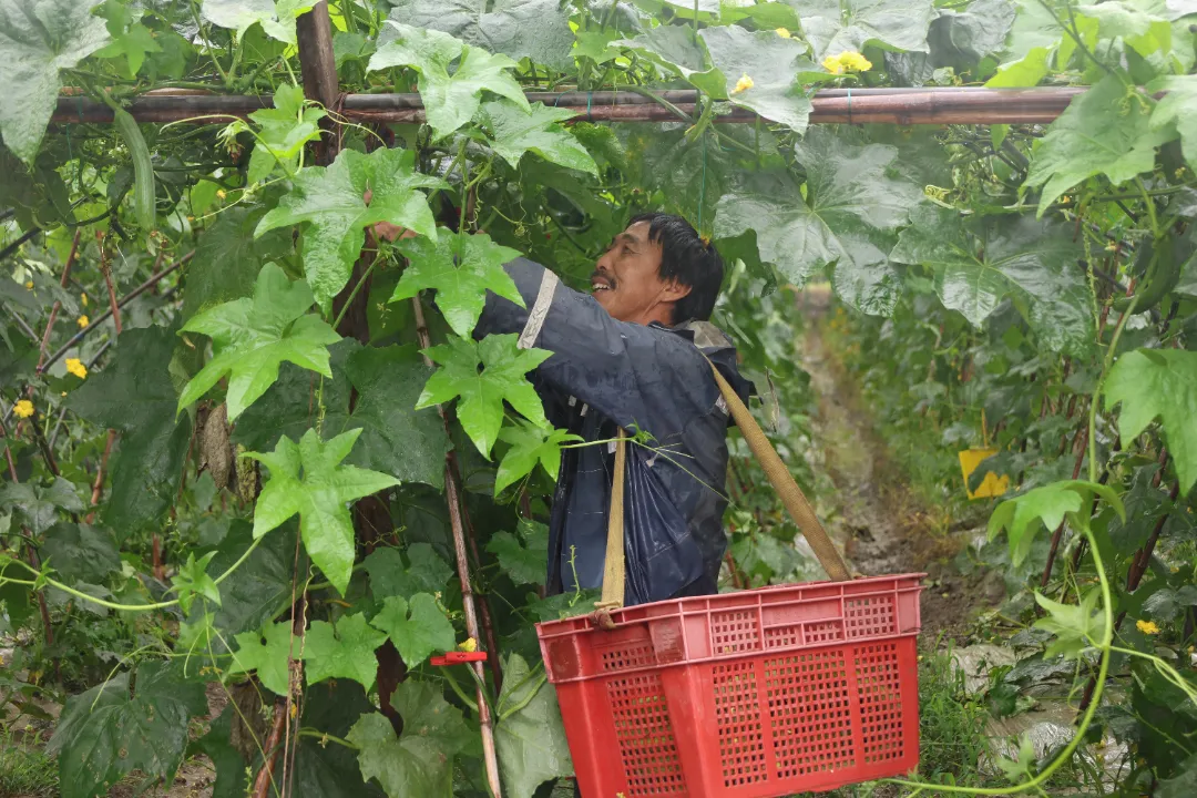 位于杨家庄村的伟玉合作社基地,共种植果蔬面积334亩。这几日,趁着雨停,农户们正在田间地头积极抢收成熟的果蔬。“现在丝瓜正当季,我们正在大量采摘,一来是减少生产损失,二来也是保障市场的正常供应。”农户说道。