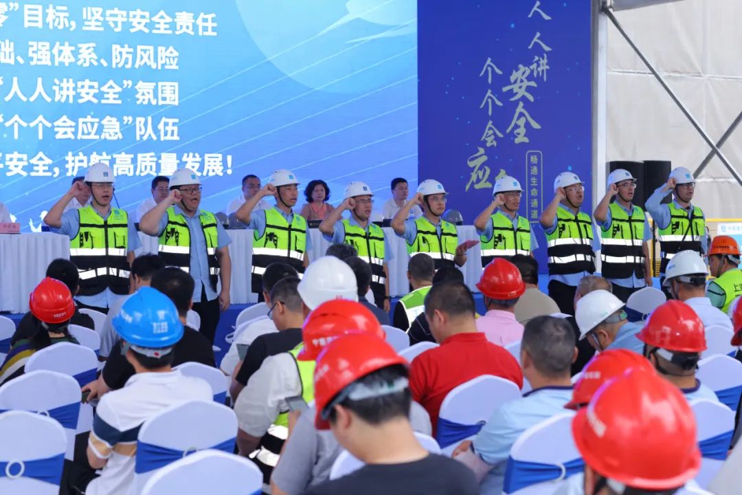 中建八局上江南住宅项目经理俞宏伟带领项目全体人员进行安全承诺,项目全体人员坚持锚定“双零”目标,坚守安全责任,夯基础、强体系、防风险,致力营造“人人讲安全”的安全氛围,锻造“个个会应急”的管理团队,发扬铁军精神,安全、优质、高效地完成项目建设。