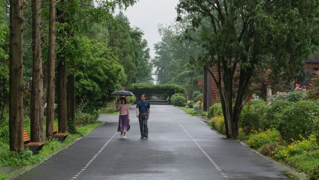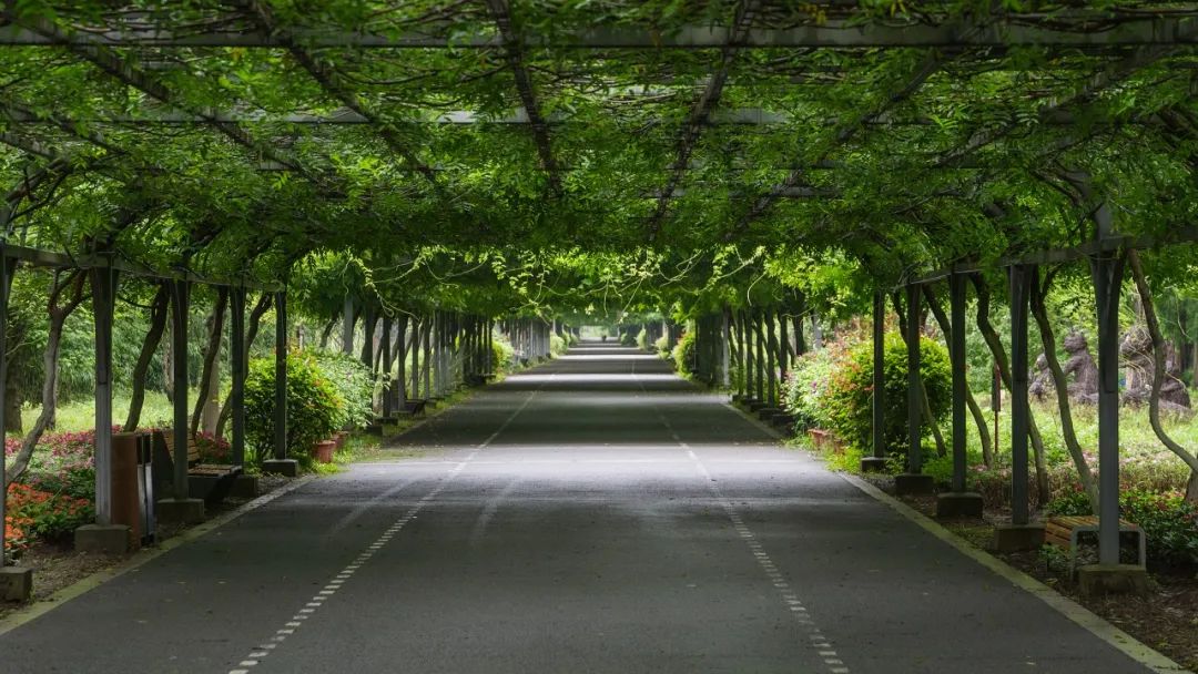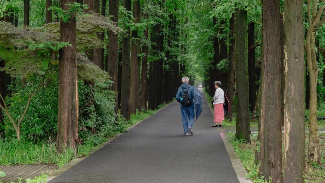 在公园幽深的紫藤长廊内、水杉夹道上,