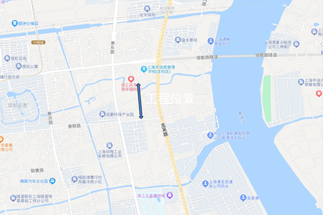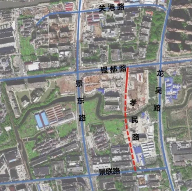 工程位于闵行区、徐汇区交界处,南起闵行区景联路,北至关港河以北约100米处(现状孝民路),新建道路全长约0.45公里,设计速度30公里/小时,建设规模为双向2车道,新建跨关港河桥梁一座,同步建设雨污水管线、绿化、照明、交通安全设施和无障碍设施等。