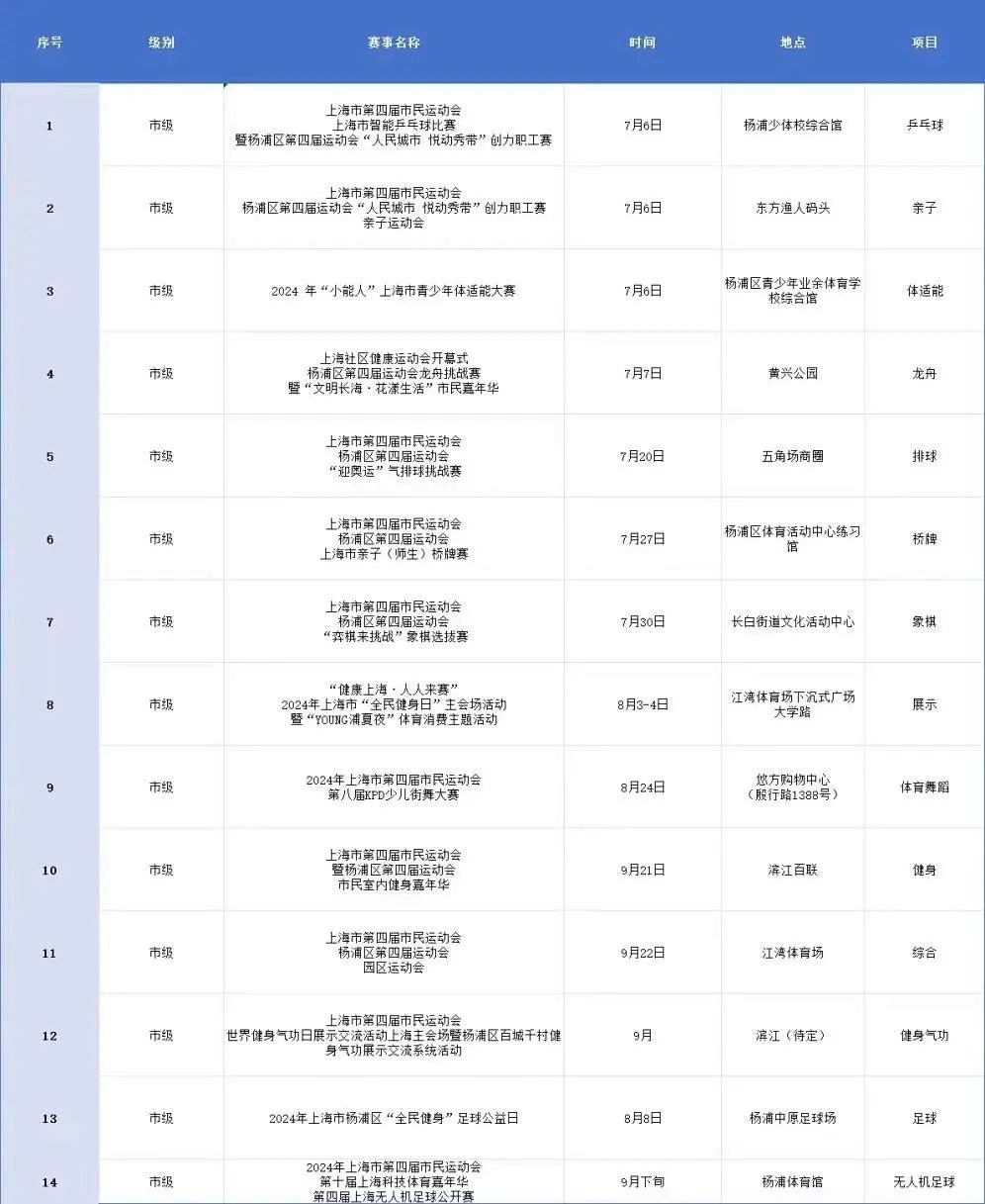 7月至8月巴黎奥运会期间,将在全区范围内开展全民健身日、全国跳绳比赛等多项赛事共迎奥运。同时,在“上海之夏”国际消费季期间,杨浦将持续开展特色鲜明、时尚新颖、吸引力强的全民健身活动,推出一批集潮玩、运动、文艺、消费于一体的体育消费特色活动。通过精彩纷呈的赛事活动和丰富多彩的体育运动,让更多消费者参与“上海之夏”,体验运动健身、体育休闲的乐趣。结合新一轮杨浦区体育消费券配送活动,在体育消费旺季提供更多的惠民服务。
