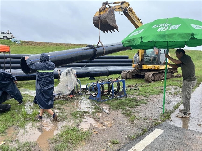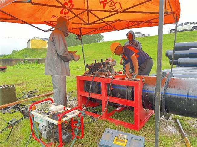 进行分泄。此次救灾行动出动3个施工班组,调用挖机1台、柴油发电机组3台、吊车1辆以及DN500热熔对接机3台,顺利焊接10根DN500PE排水管。历经10余小时奋战,闸口镇抗洪排涝工作顺利进行,最大限度地减少了灾害损失。