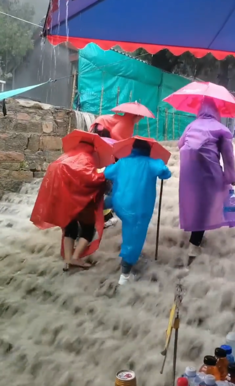 游客称爬泰山突遇暴雨,台阶变瀑布。网络截图
