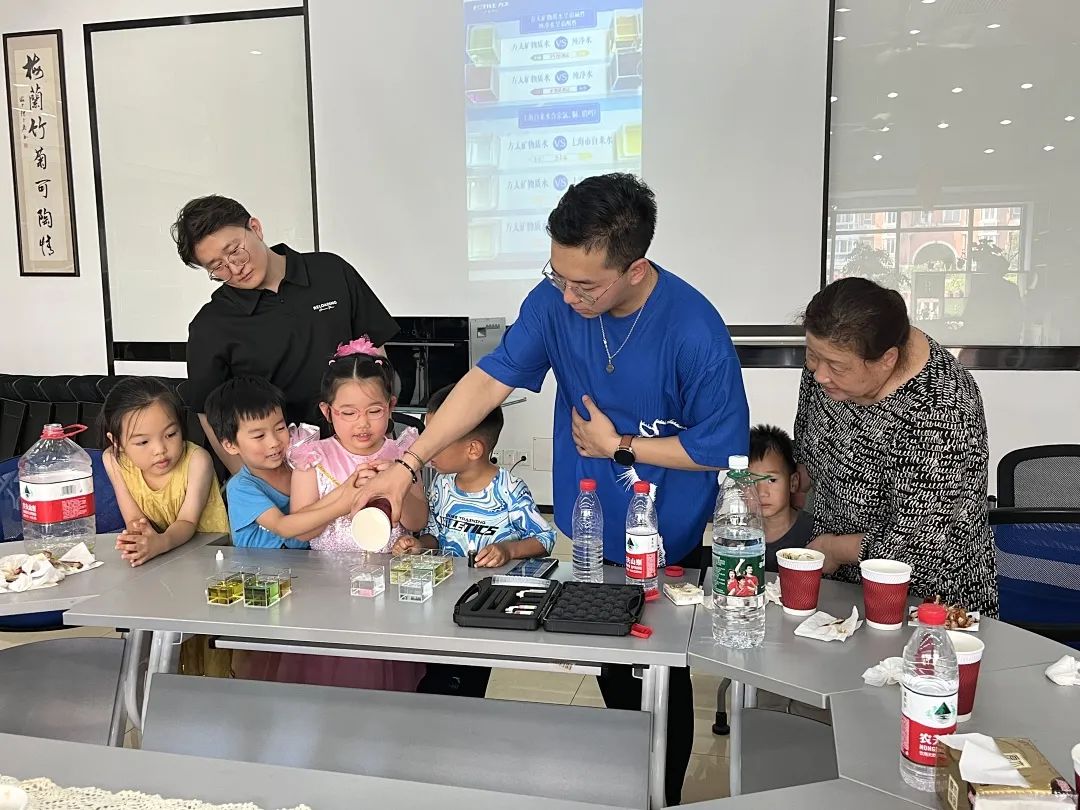 除了美食制作,科学小实验环节更令孩子们感到新奇有趣。工作人员将矿物质水与纯净水进行成分对比,向大家介绍了矿物质水和纯净水的不同之处,并通过简单有趣的实验展示了两者在化学性质上的差异。孩子们在实验台前围成一圈,动手动脑,积极参与,现场笑声不断。