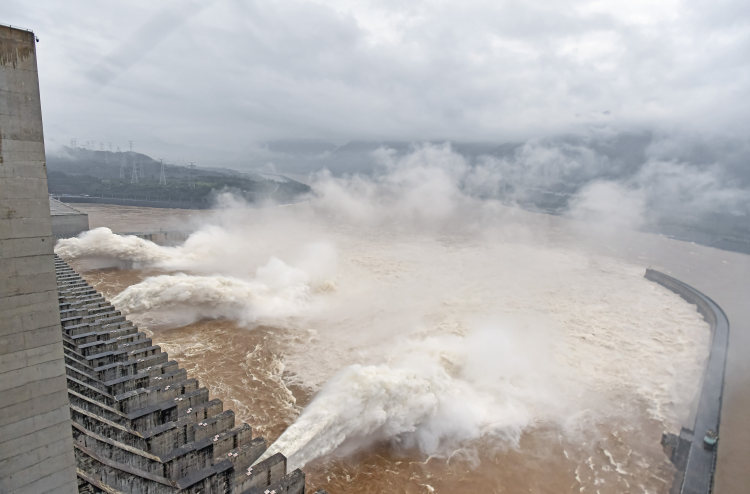 7月11日下午,三峡大坝三孔泄洪,白浪翻腾。