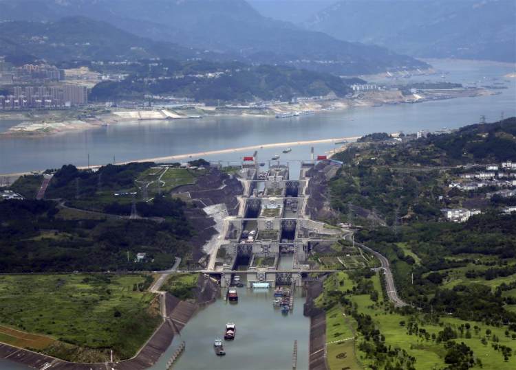 据了解,三峡船闸是目前世界上总水头最高、规模最大的内河船闸,双线连续五级布置,平时北线上行,南线下行。每线有5个闸室,每个闸室长280米,宽34米,三峡船闸双线运行每天约31闸次,单向最高18闸次,每闸次平均通过4.1艘船、通过1.25万吨货物。