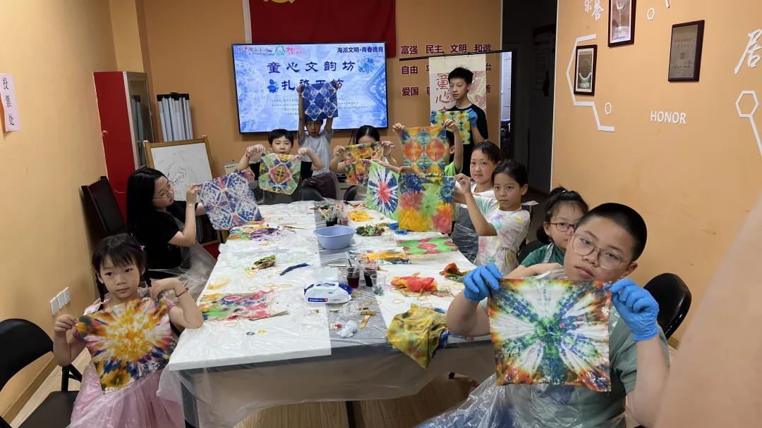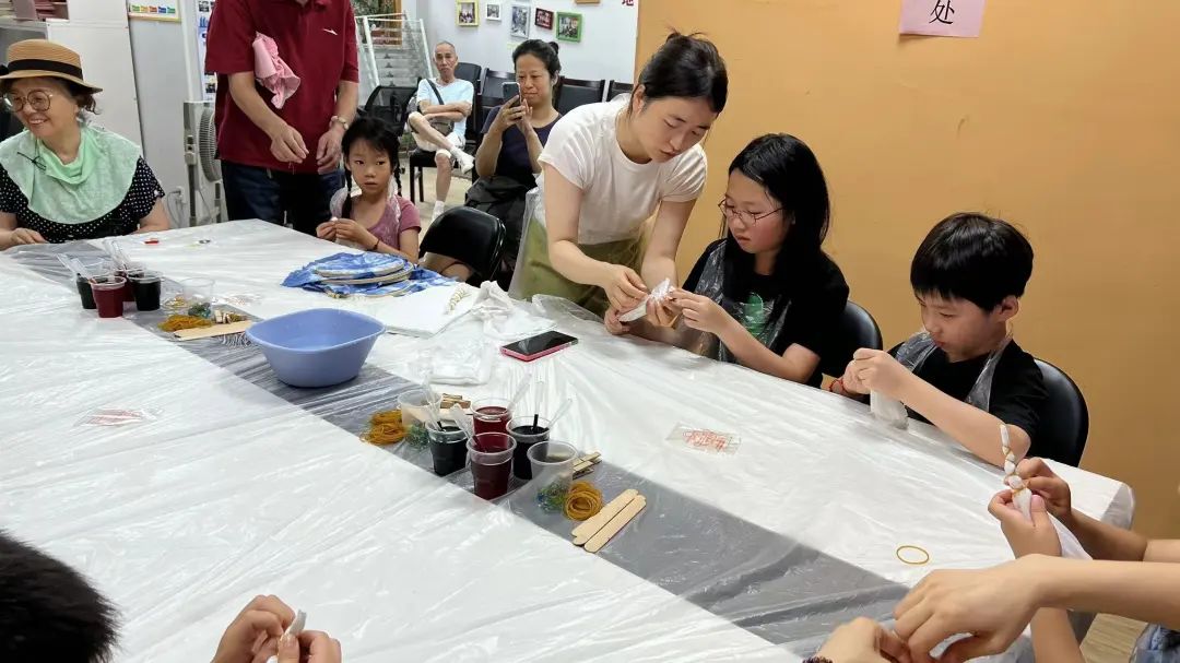 徐汇区徐家汇街道启明居委会近日开展一场“童心文韵坊”扎染工坊活动。这项迷人的手工技艺,引领孩子们亲身体验中华民族传统文化的独特韵味。