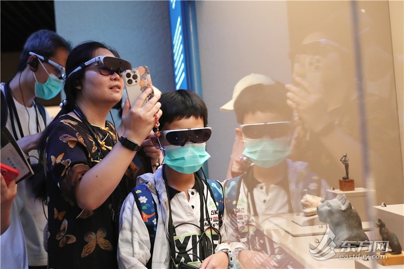 室外,上海骄阳似火;馆内,游客热情高涨。一楼三个展厅门口也排起了队伍,工作人员有序地放观众入场。每个雕像前都有观众驻足,有些带孩子的家长耐心地解答着孩子的疑惑。在萨卡拉的秘密展区,猫咪喵喵叫的BGM循环播放,让大人和孩子们都兴奋不已。
