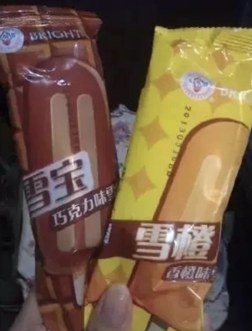 雪宝,就是浓郁的牛奶与巧克力的奇香混合在一起的雪糕;雪橙,就是橘子棒冰,酸酸甜甜的味道,吃完透心凉,倍儿爽。