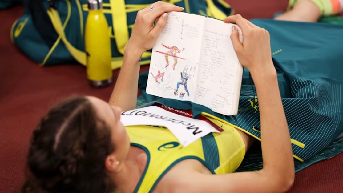 东京奥运会银牌得主尼古拉·奥利拉格斯有一本神奇的日记本:绿色的封面,内页充斥着线条、笔记和各种颜色的涂鸦。每到比赛间歇,她总会捧着这本日记。