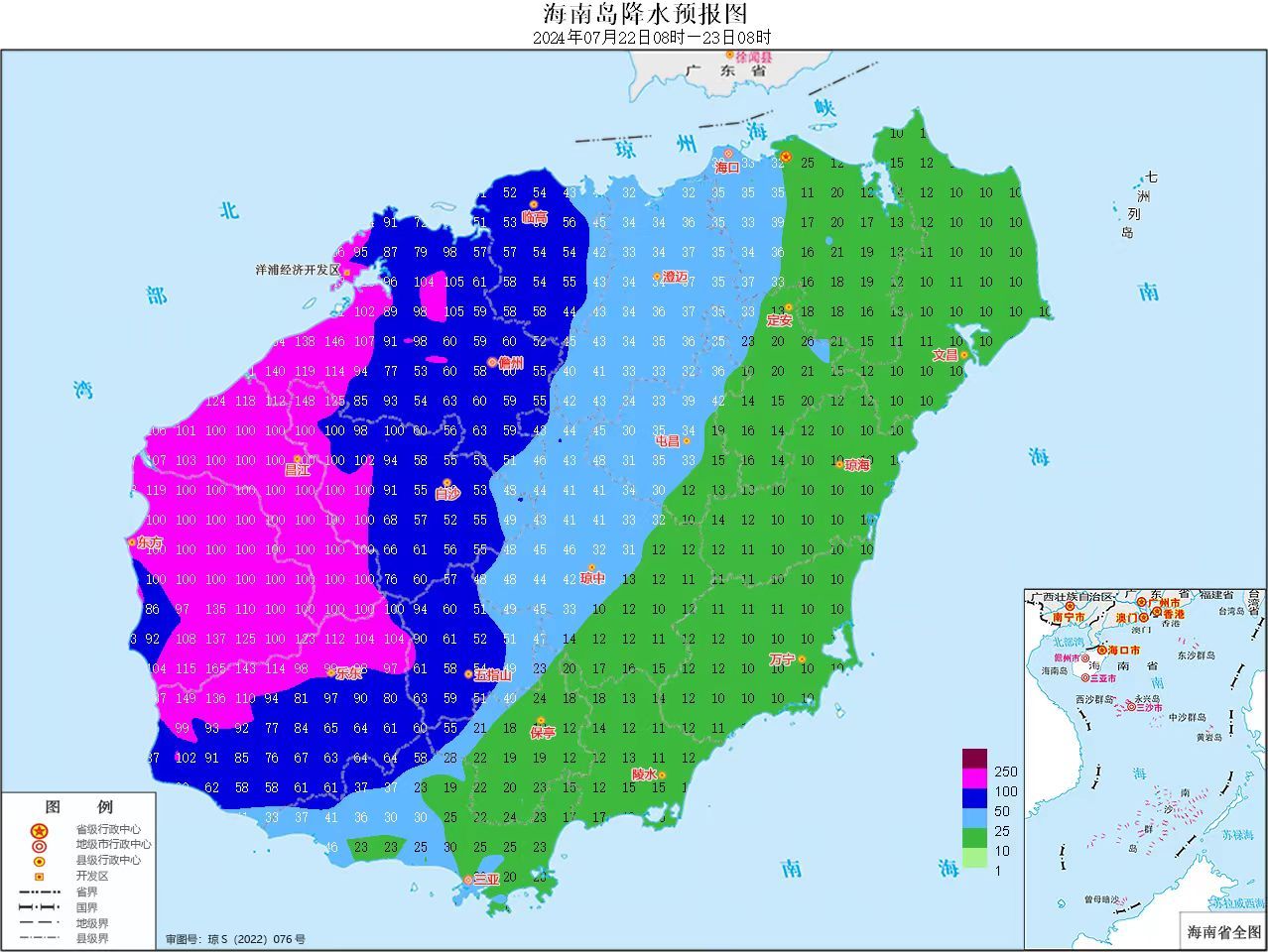 受其影响,海南省气象局2024年7月22日10时继续发布暴雨三级预警,儋州、白沙、昌江、东方和乐东等市县累积雨量100~150毫米、局地200毫米,临高、澄迈、琼中和五指山等市县50~100毫米;琼州海峡、本岛东部海面22日白天起风力减弱为6~7级、阵风8级;北部湾海面、本岛西部和南部海面有10~12级阵风。