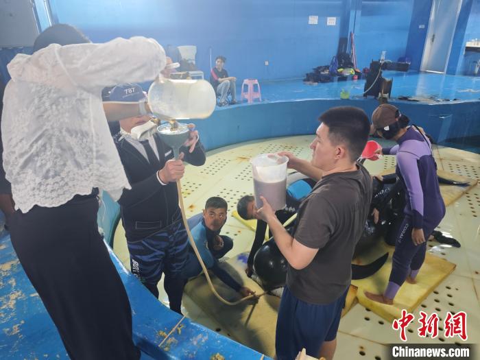 7月23日,在三亚海昌生物保育中心,志愿者们给短肢领航鲸“海莉”灌食鱼浆。张月和 摄