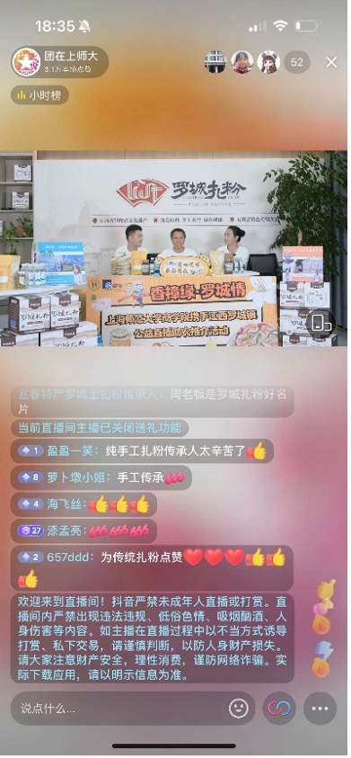 借助学校“团在上师大”抖音直播平台,团队最终完成了时长2小时,包含农副产品介绍、非遗技艺推广、文旅科普、嘉宾采访、试做试吃等13个环节的直播活动。