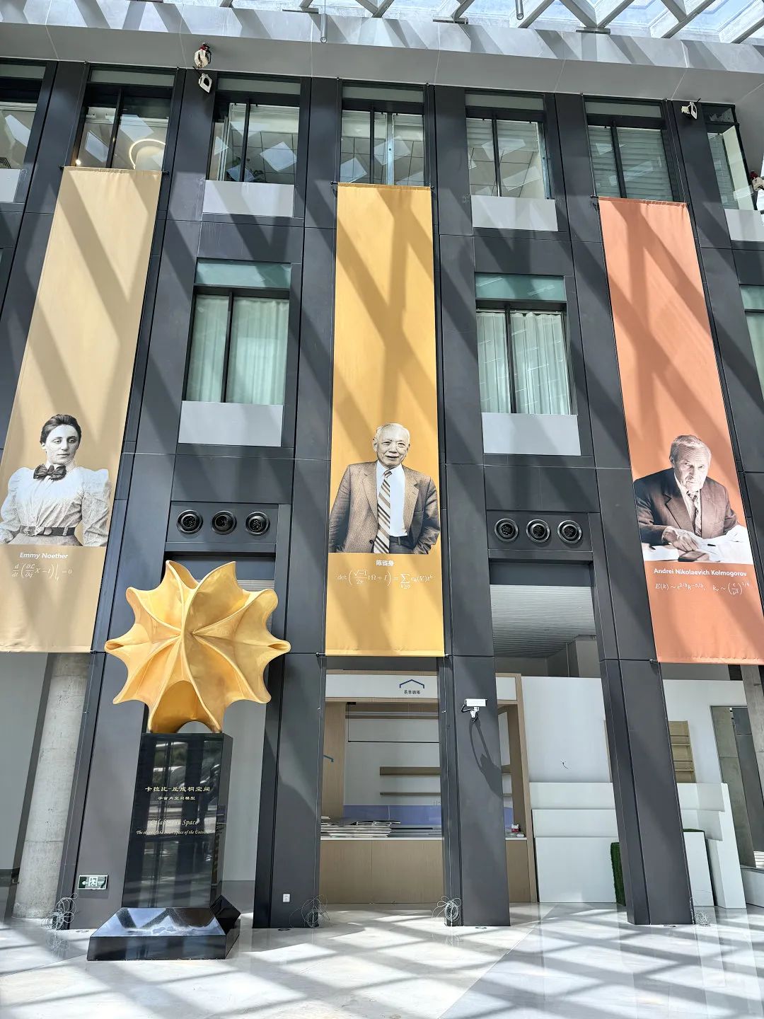 推开淞沪路657号研究院的大门,落地窗前阳光倾泻而来,玻璃天棚投射出几何形暗影,还有醒目的卡拉比-丘成桐空间(宇宙内空间模型)......种种巧心匠制构建起一个充满数学学术氛围感的公共空间。