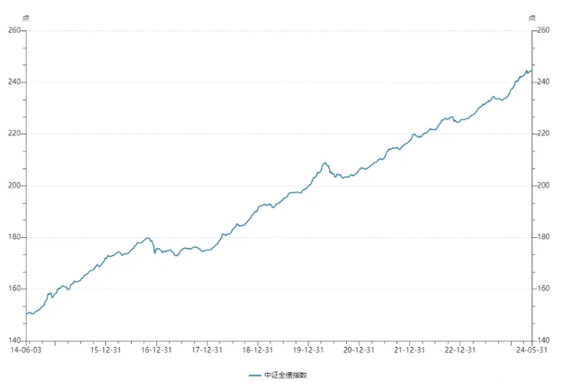 这类产品的好处,是波动小、回撤少,风险比投资股票要低很多,但回报利率比定期存款要高,目前基本在3%左右,优秀的可能会更高。如果你去观察这些产品的波动曲线,经常能看到一根持续向上的近似直线,很少看到大幅波动。以10年中证全债指数走势为例,可以看到虽然债市出现过多次调整,但长期走势依旧持续向上。一个字,稳。