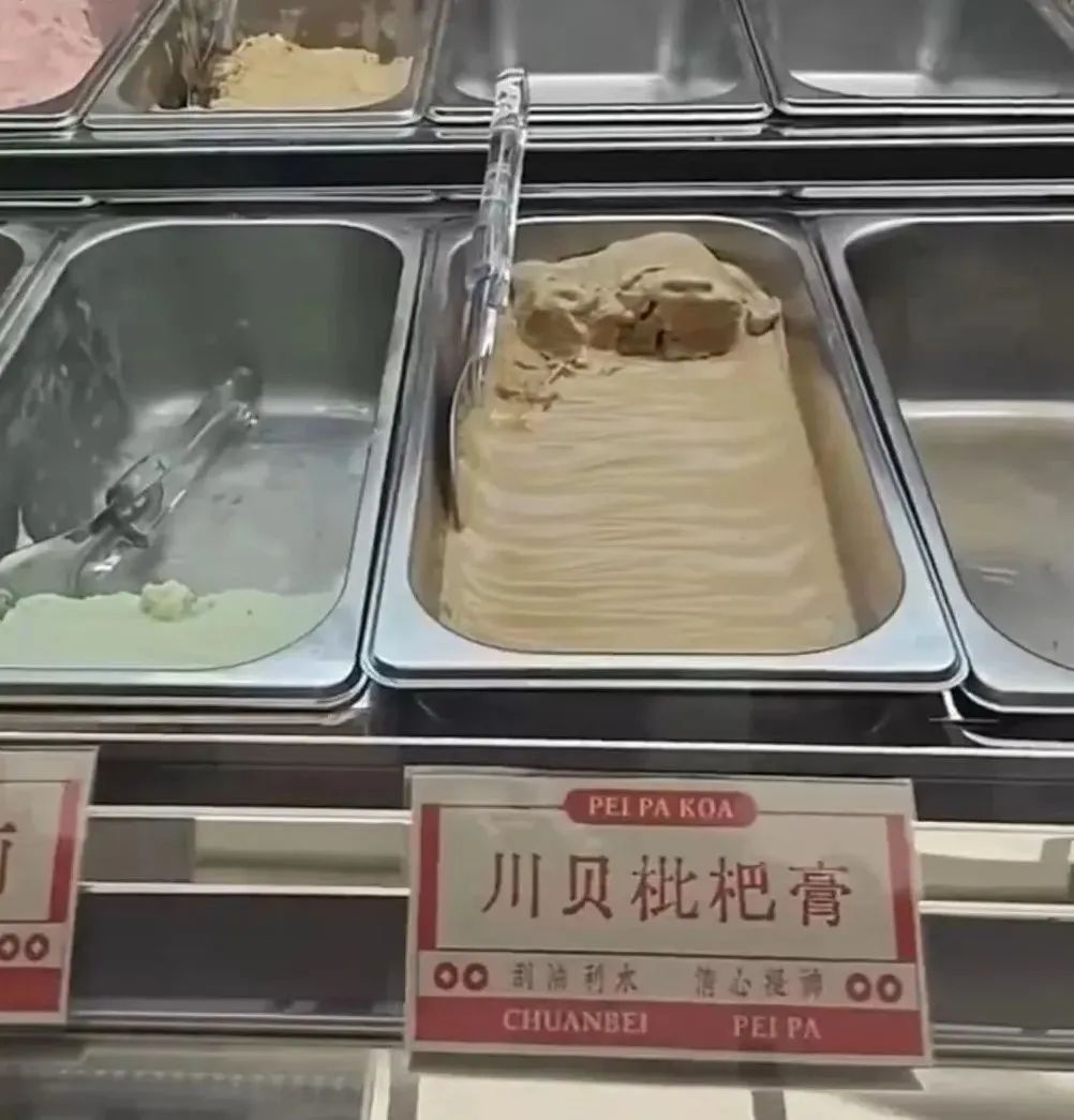 热门口味如薄荷西瓜霜、野菊开心果、烟熏乌梅、竹香茉莉、山楂佛手柑、川贝枇杷膏等,光听名字就很“本草纲目”,还很受欢迎,装冰淇淋的格子,好几个都空了!