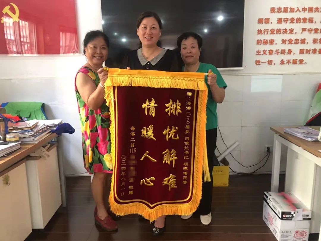 “排忧解难,情暖人心”几个金灿烂的大字在红色的锦旗上熠熠生辉。8月5日上午,海滨二村116号楼的居民陈阿姨、顾阿姨将一面代表她们诚挚谢意的锦旗和两封感谢信送到海滨二村第二居民区党总支书记刘俊兰手中。