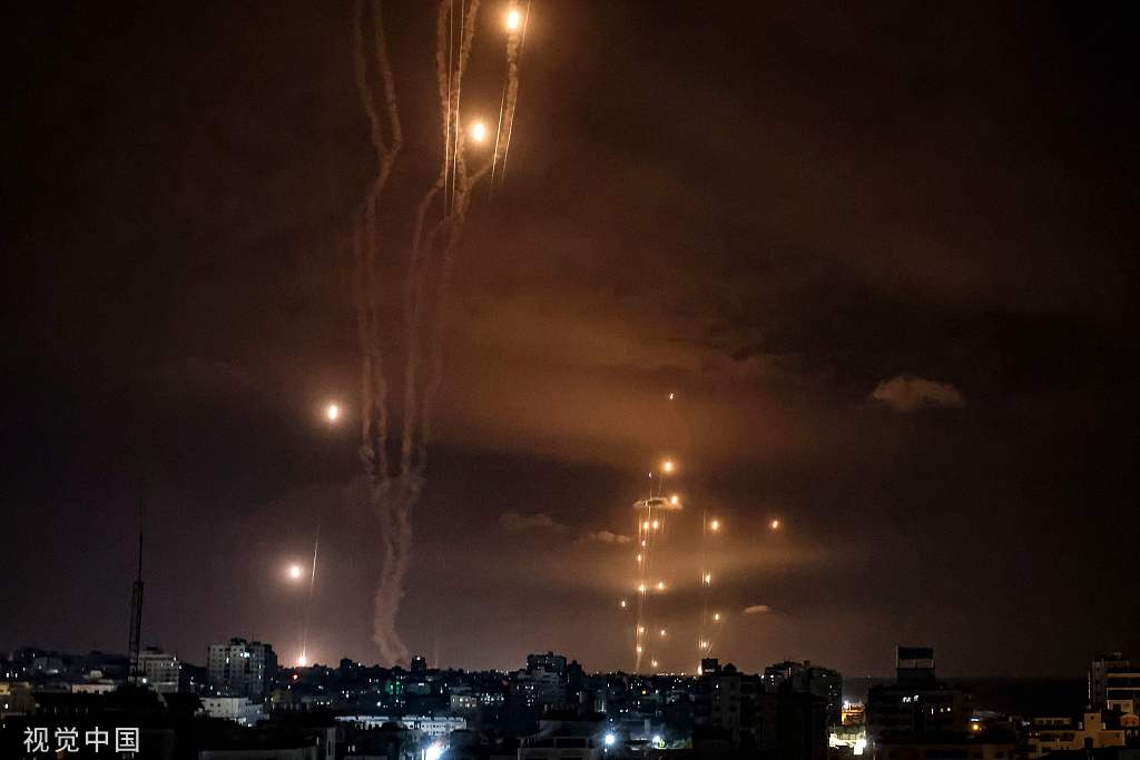 2023年10月7日,巴勒斯坦武装分子从加沙城发射的火箭被以色列铁穹防御导弹系统拦截视觉中国