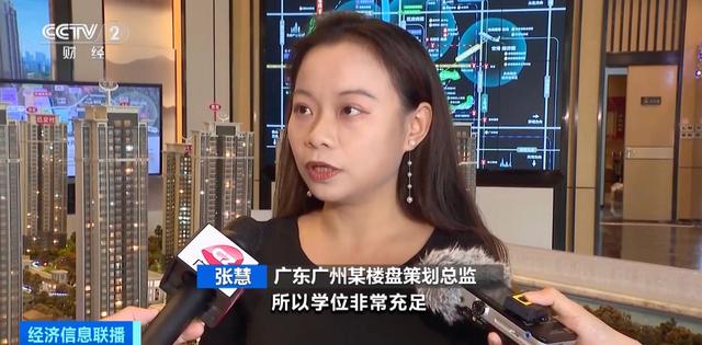 广东广州某楼盘策划总监 张慧:项目30米之隔就有一个小学,很多人想入读这所学校,今年这所学校9月份开学,学位很充足,很多人是根据政策了解这个项目。