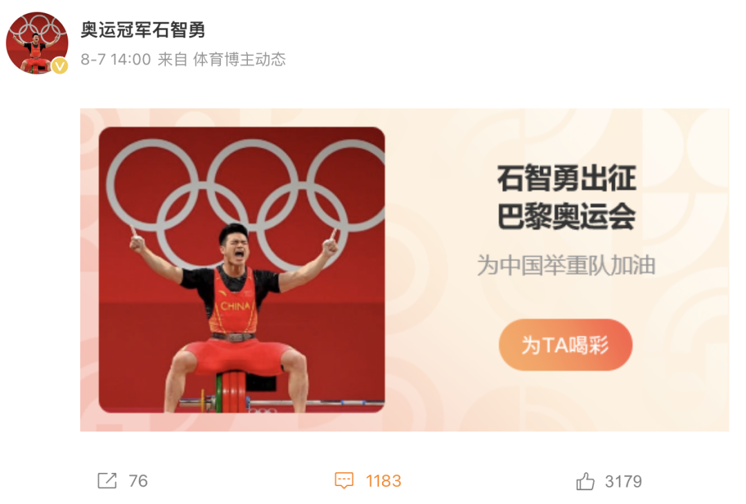 比赛中,第三次出战奥运会的老将石智勇在抓举以165公斤排名第一,但在之后的挺举三次试举191公斤失败,遗憾无缘奖牌。赛后石智勇流下不甘的泪水,他透露:“挺举第一把可能还是有点着急,第二把没举起来有点懵,第三把内收肌可能断了,我听到‘啪’的一声。”
