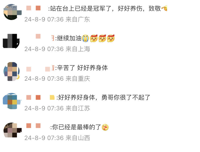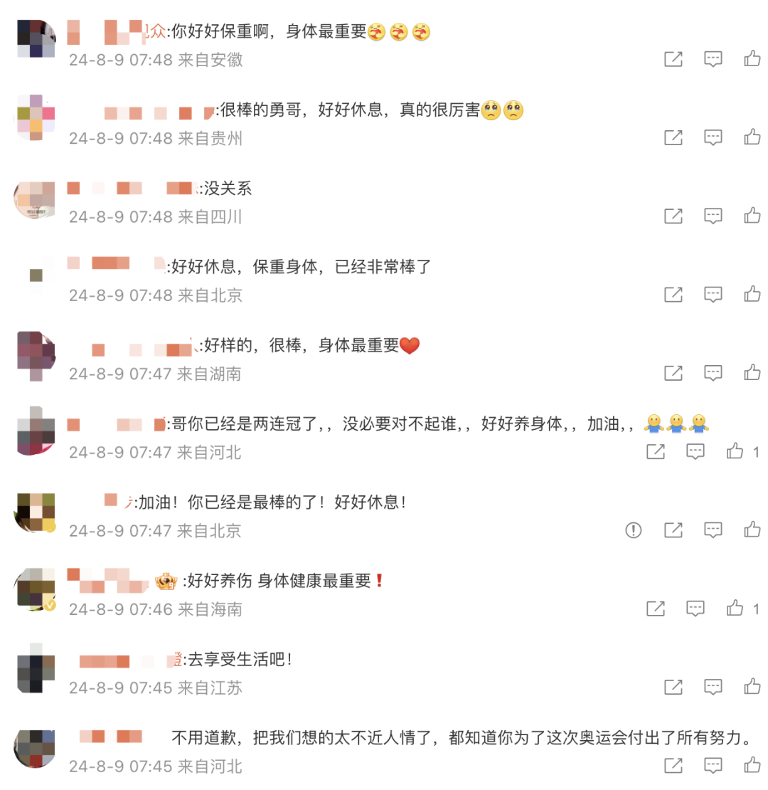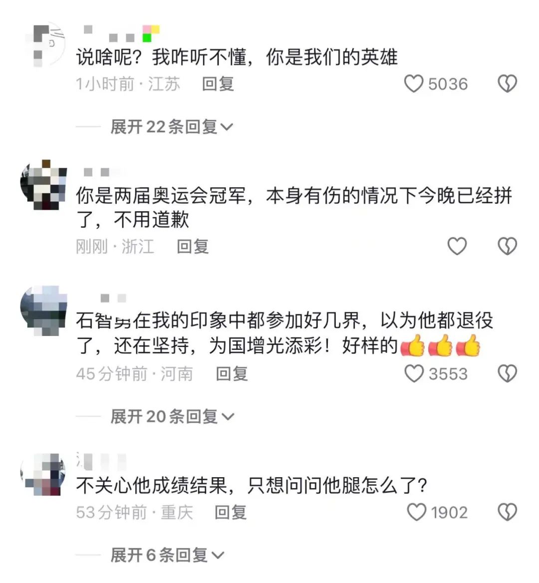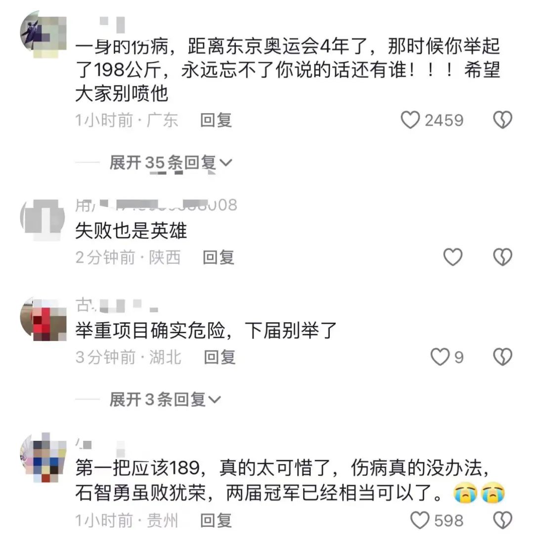 赛后石智勇非常自责,他表示:“对不起中国举重队,大家一直很信任我,给了我最好的保障,但我没能做出贡献,我想自己是失败的。”其实巴黎奥运备战周期,石智勇一直与腰伤对抗,他表示自己的精神支柱就是奥运会,如今奥运会结束了,他可能会考虑退役。“实在受不了病痛的折磨,我真的尽力了,没取得预想的成绩,我对不起大家。”